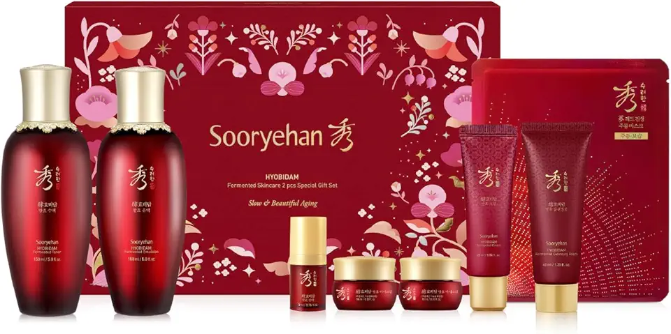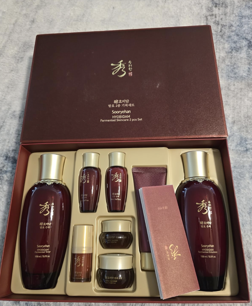 Sooryehan Hyobidam Fermented Set (14 fl oz total, 1.2 lbs) includes toner, emulsion, essence, cream, eye cream, mask & foam. Wild ginseng anti-aging, hydration, firming. Luxury gift set. 1-year warranty.